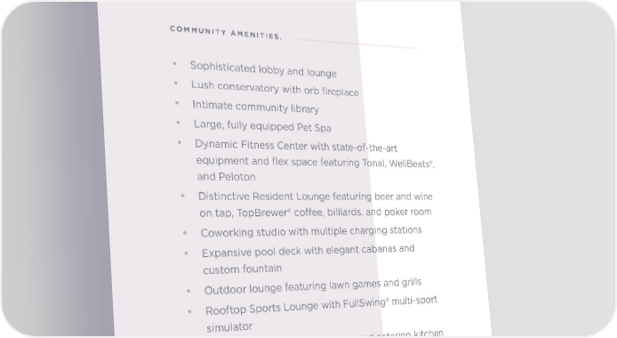 . Y URIOUSL X U LIVE L SOPHISTICATED SPACES Aster’s collection of boutique amenities brings a COMMUNITY AMENITIES. curated lifestyle lineup to the heart of Dallas. With a balance of social spaces and wellness-minded respites, •Sophisticated lobby and lounge Aster fosters a thoughtful, connected community •Lush conservatory with orb fireplace featuring personalized touches and enduring •Intimate community library elegance throughout.•Large, fully equipped Pet Spa • Dynamic Fitness Center with state-of-the-art equipment and flex space featuring Tonal, WellBeats®, and Peloton • Distinctive Resident Lounge featuring beer and wine on tap, TopBrewer® coee, billiards, and poker room • Coworking studio with multiple charging stations • Expansive pool deck with elegant cabanas and custom fountain • Outdoor lounge featuring lawn games and grills • Rooftop Sports Lounge with FullSwing® multi-sport simulator • Sky Lounge with private dining and catering kitchen • Roof Terrace with lounge seating, widescreen TV, and stunning views of Dallas • Secured parking, electric car charging stations, Package Concierge® lockers • Community-wide Wi-Fi