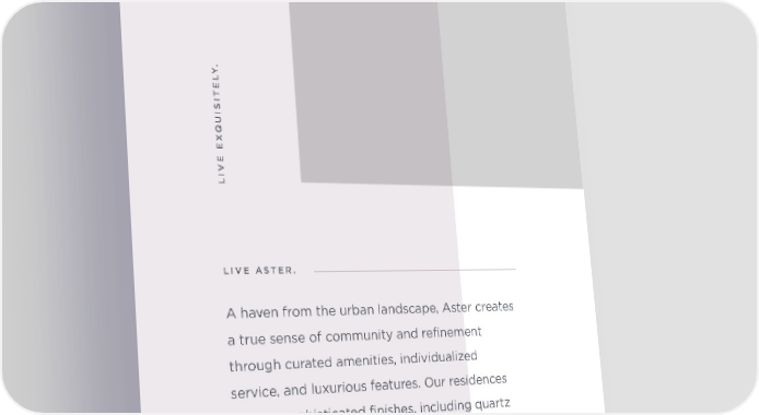 . Y QUISITEL AN ORGANIC ESCAPE LIVE EX LIVE ASTER. A haven from the urban landscape, Aster creates a true sense of community and refinement through curated amenities, individualized service, and luxurious features. Our residences feature sophisticated finishes, including quartz countertops and marble backsplash, and our elevated communal spaces, from the lush conservatory to the spa-inspired pool deck, invite you to discover why Aster is not just a place to live, but a way to live.